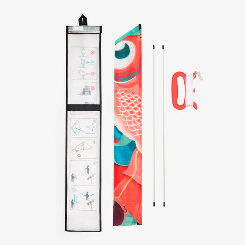 Cerf-volant statique une ligne, livré plié avec une poignée et 36 mètres de ligne polyester, ainsi qu\'une une baguette transversale. Le tout dans une pochette de rangement textile (longueur pochette : 63 cm) Dimension monté :100 cm d\'envergure/ 59 cm de hauteur Montez la baguette côté non coloré, accrochez la ligne côté coloré, et c\'est parti!