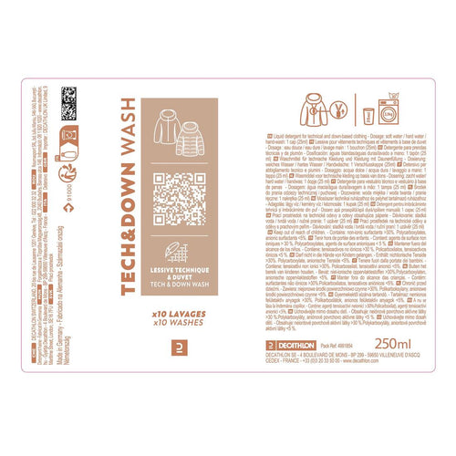 Contrairement à une lessive ordinaire, ce produit sans détergent ni parfum, enzymes ou autre azurant optique préserve intactes les propriétés du vêtement. Sans agresser les fibres pouvant altérer la performance, la résistance, la respirabilité et le gonflant du duvet, cette solution viendra nettoyer en douceur. Elle vous permet de réaliser jusqu\'à 10 lavages avec 250 ml. Elle est également parfaite à utiliser en prélavage d\'un vêtement avant d\'appliquer un traitement imperméable.