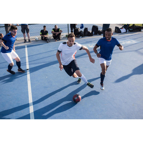 C\'est en observant les joueurs de Futsal sur les terrains extérieurs que notre équipe de conception a pensé et conçu ce ballon de Futsal. Résistant grâce à sa construction hybride : pour la conception de ce ballon, nous avons mixé le confort du cousu machine avec la résistance du cousu main. De plus nous avons choisi un PU plus résistant à l\'abrasion et une vessie windée (2 kilomètres de fil qui enroulent la vessie) afin de vous garantir un gonflage plus résistant et une meilleure sphéricité.