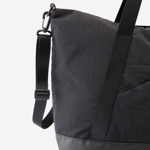 Votre cours de yoga matinal vient de finir ? Vous posez votre tapis roulé sur le sac, entre les anses. Ce sac se porte selon votre préférence grâce aux poignées ou à la bandoulière ajustable et amovible. Il se ferme avec un zip. Dehors, un sol humide ? Pas d’inquiétude, le fond déperlant renforcé protège vos affaires. D\'ailleurs, le textile du sac est entièrement déperlant. Et pour votre prochaine escapade ? Ce sac passe en cabine. Vérifiez les dimensions auprès de votre compagnie.