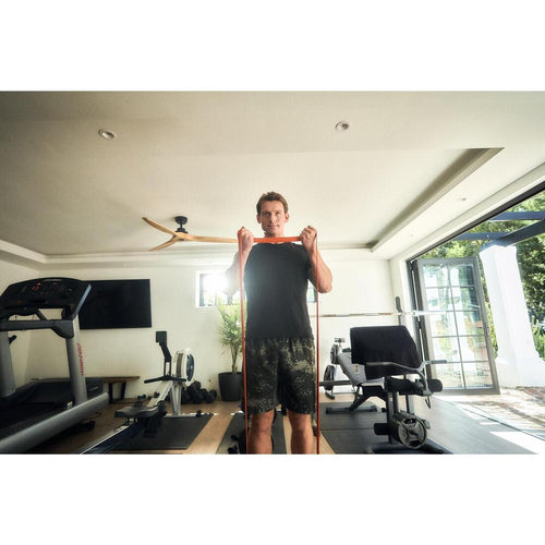Cet élastique possède une résistance importante. Il peut s\'avérer utile pour vous délester si vous commencez en traction sur une barre (réf : 8385106) ou un rack (réf : 8651534) par exemple, ou lorsque faites vos débuts avec une roue abdominale (réf : 8660093). Vous pouvez également vous en servir pour vous étirer.