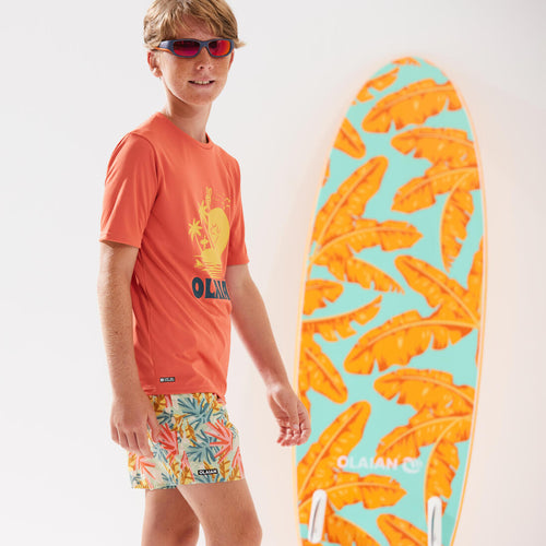 T-shirt anti-UV junior manches courtes pour protéger du soleil, même dans l'eau, et limiter les irritations au contact de la planche. Coupe ample pour un enfilage facile.